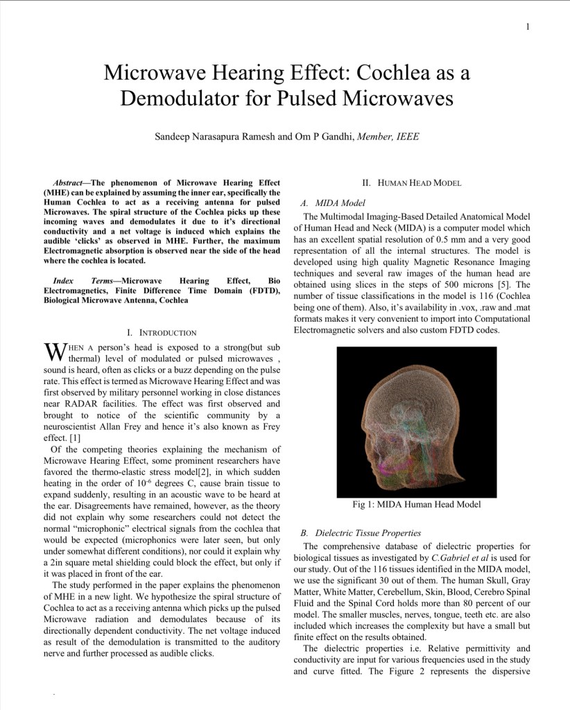 A person’s head is exposed to a strong(but sub thermal) level of modulated or pulsed microwaves, sound is heard, often as clicks or a buzz depending on the pulse rate. This effect is termed as Microwave Hearing Effect and was first observed by military personnel working in close distances near RADAR facilities.