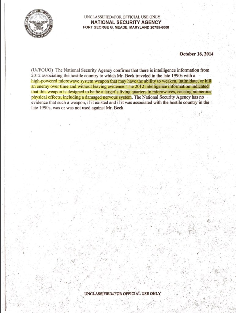🔑 Admits: high-powered microwave system weapon that may have the ability to weaken, intimidate, or kill an enemy over time and without leaving evidence. The 2012 intelligence information indicated that this weapon is designed to bathe a target’s living quarters in microwaves, causing numerous physical effects, including a damaged nervous system.https://int.nyt.com/data/documenthelper/202-nsastatement/665ff9158ffa09ed1e91/optimized/full.pdfhttps://int.nyt.com/data/documenthelper/202-nsastatement/665ff9158ffa09ed1e91/optimized/full.pdf