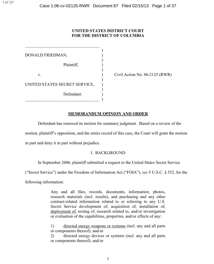 UNITED STATES DISTRICT COURT FOR THE DISTRICT OF COLUMBIA DONALD FRIEDMAN, Plaintiff, v. UNITED STATES SECRET SERVICE, Defendant.