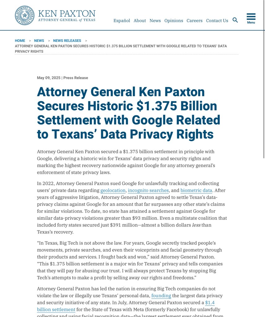 Attorney General Ken Paxton Secures Historic $1.375 Billion Settlement with Google Related to Texans’ Data Privacy Rights.