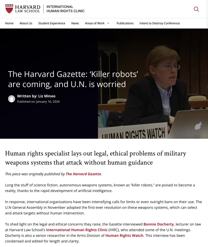 Human rights specialist lays out legal, ethical problems of military weapons systems that attack without human guidance, Harvard Law School