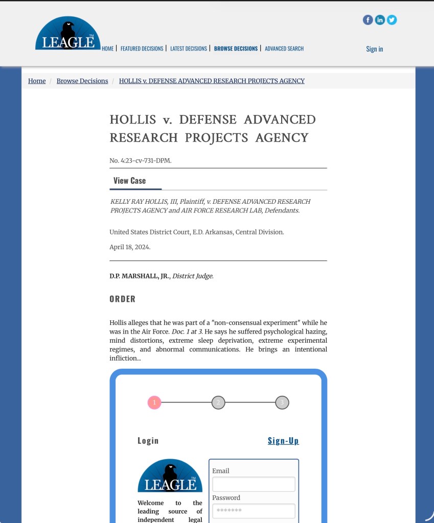 Hollis alleges that he was part of a “non-consensual experiment” while he was in the Air Force. Doc. 1 at 3. He says he suffered psychological hazing, mind distortions, extreme sleep deprivation, extreme experimental regimes, and abnormal communications.
